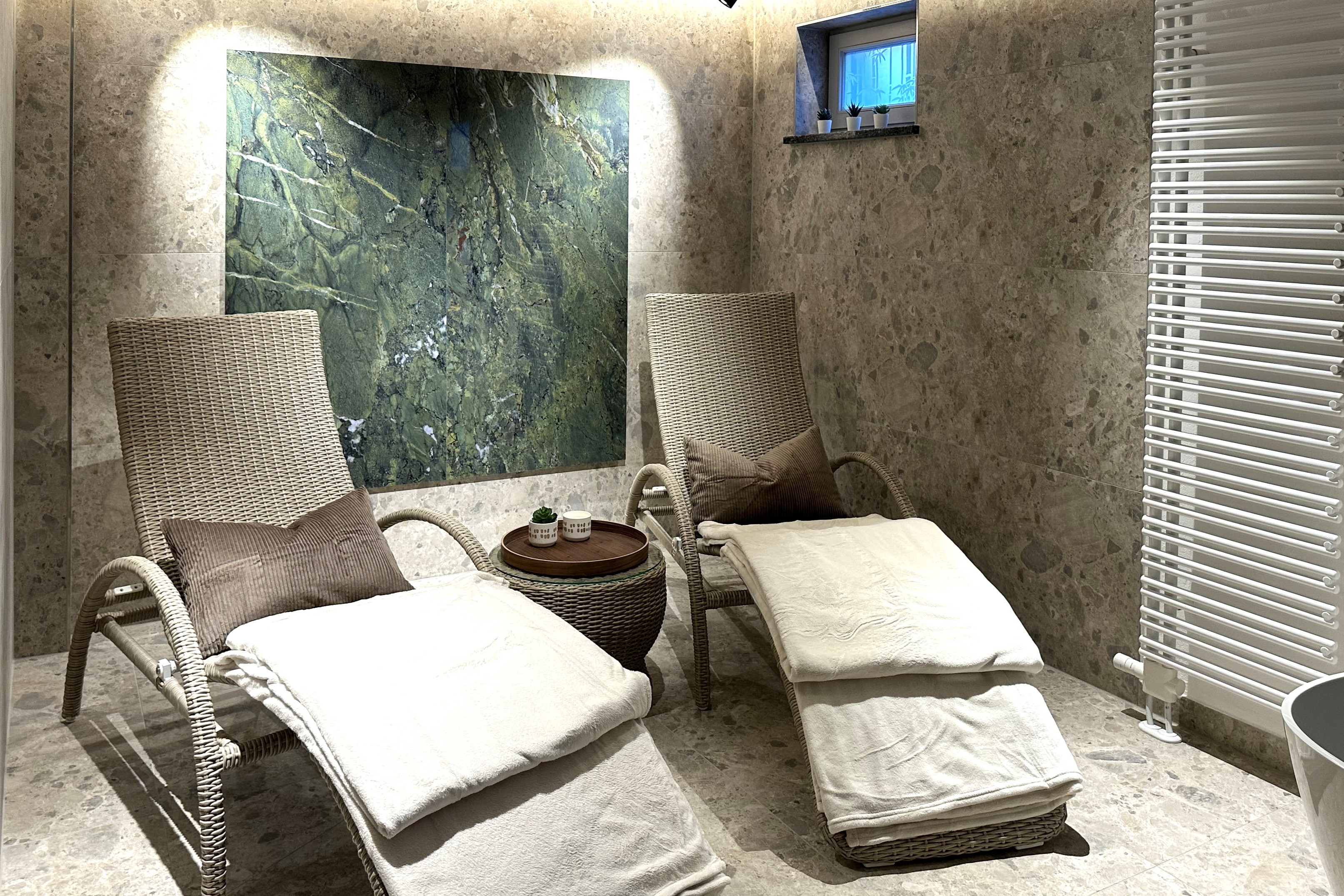 - großzügiger Wellnessbereich im Souterrain mit Sauna (mit extra breiten Liegeflächen) und Designerbadewanne